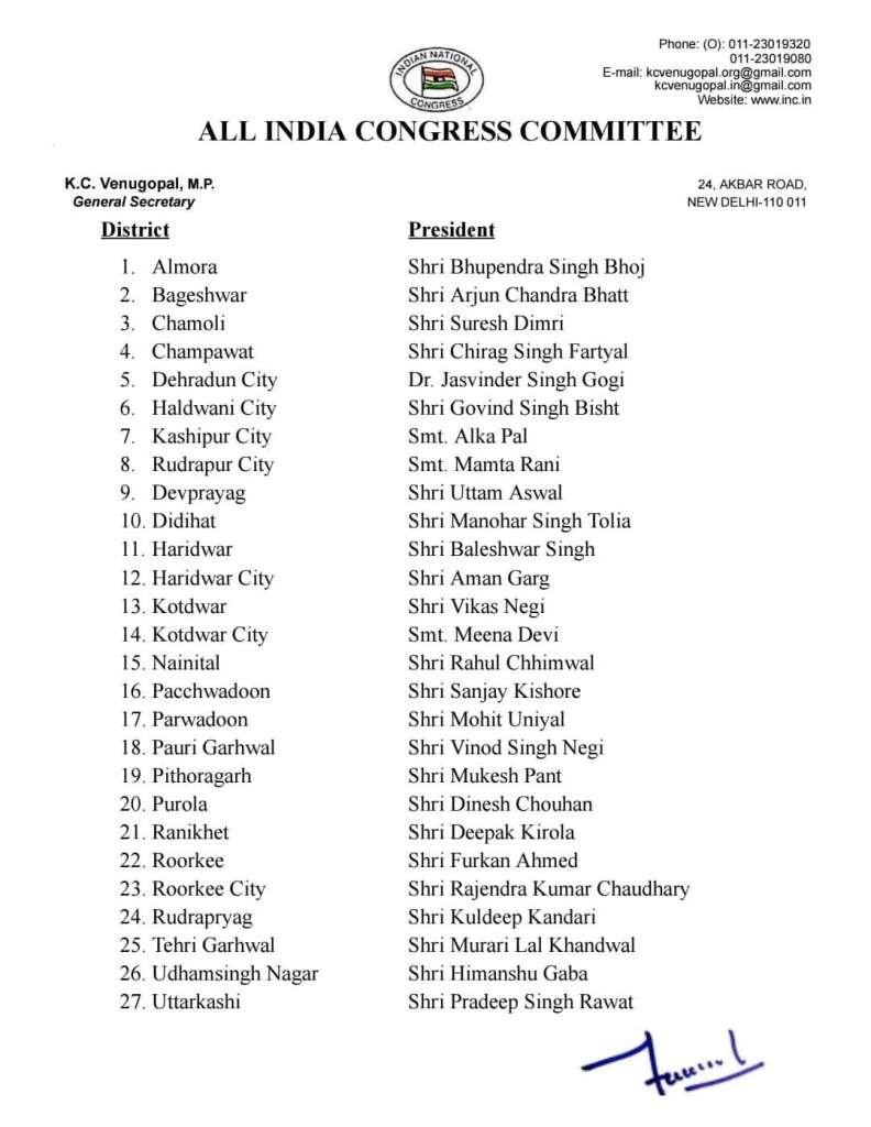 देहरादून। उत्तराखंड कांग्रेस में संगठनात्मक फेरबदल करते हुए ऑल इंडिया कांग्रेस कमेटी (एआईसीसी) ने गणेश गोदियाल को एक बार फिर प्रदेश कांग्रेस कमेटी (पीसीसी) का अध्यक्ष नियुक्त किया है। एआईसीसी के महासचिव केसी वेणुगोपाल ने मंगलवार देर रात इस संबंध में पत्र जारी किया। इसके साथ ही जिलाध्यक्षों के नामों की भी घोषणा की गई है।